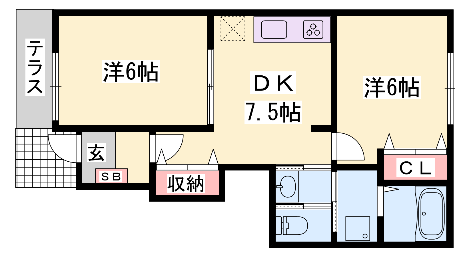 - DK7.5帖、洋室6帖、洋室6帖