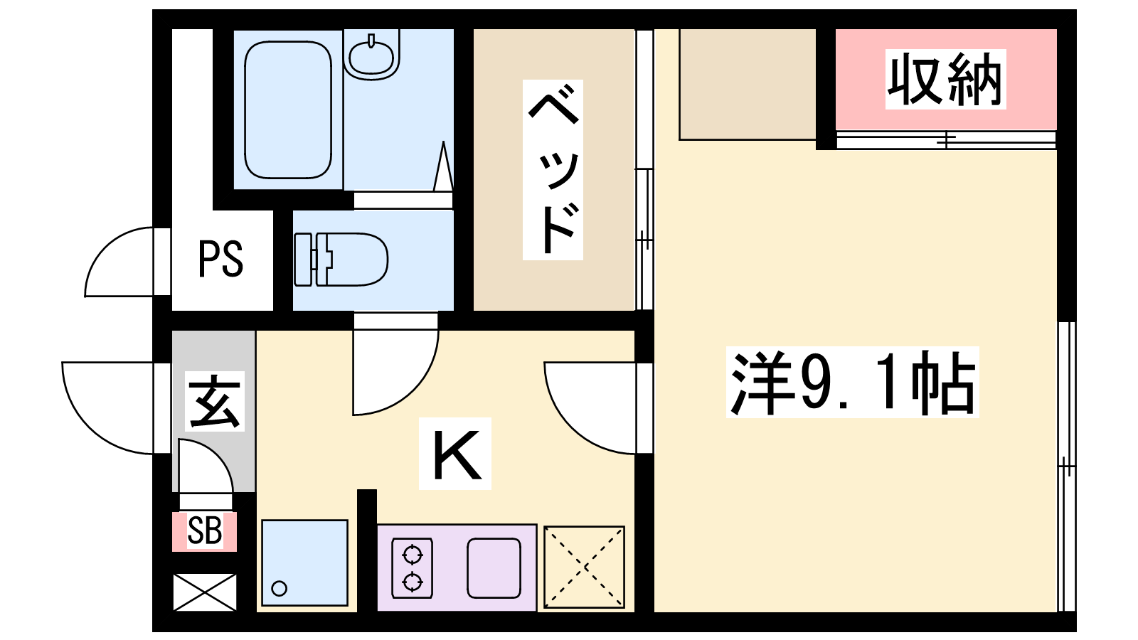 - K2帖、洋室9.1帖