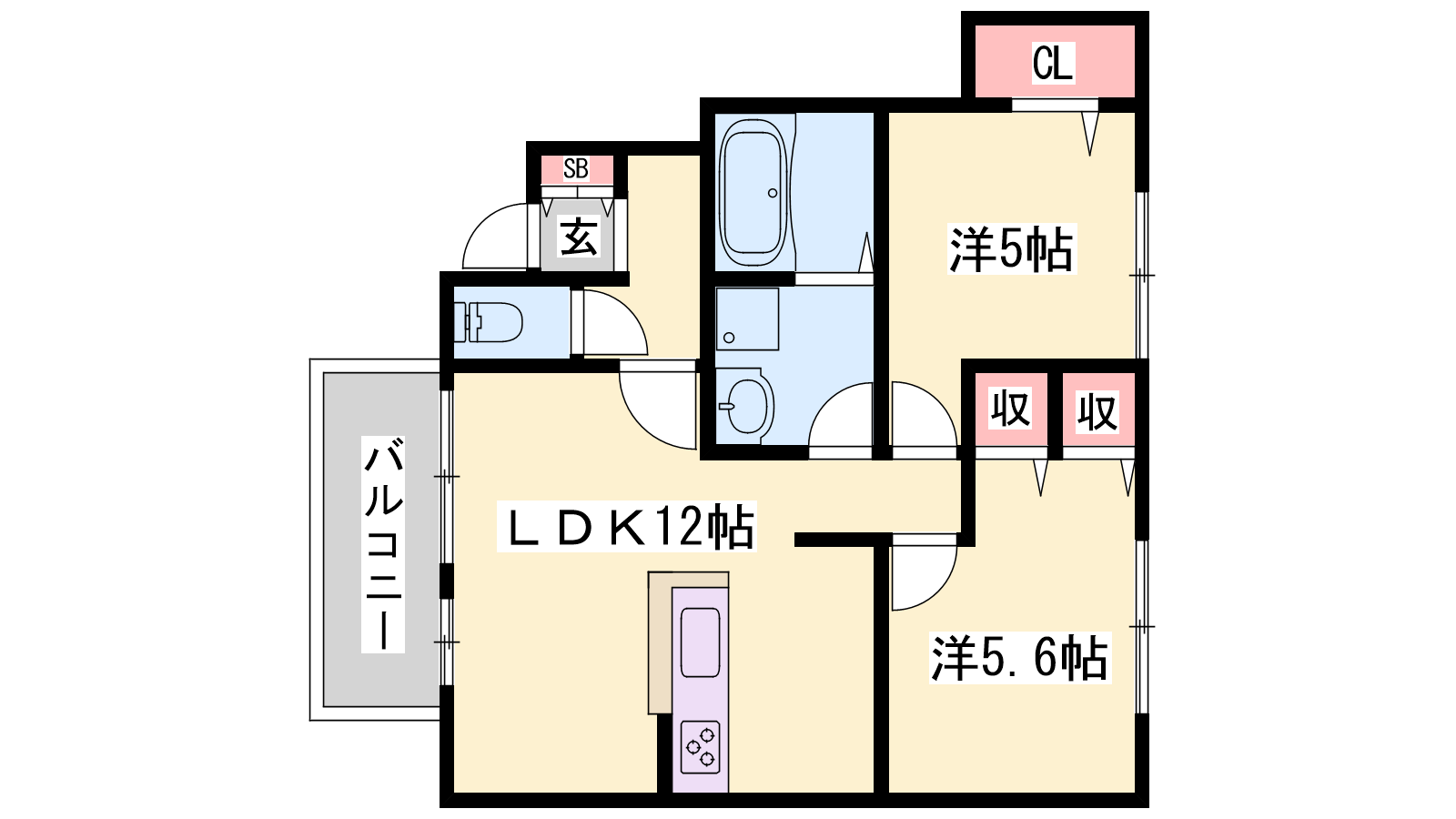 - LDK12帖、洋室5.6帖、洋室5帖