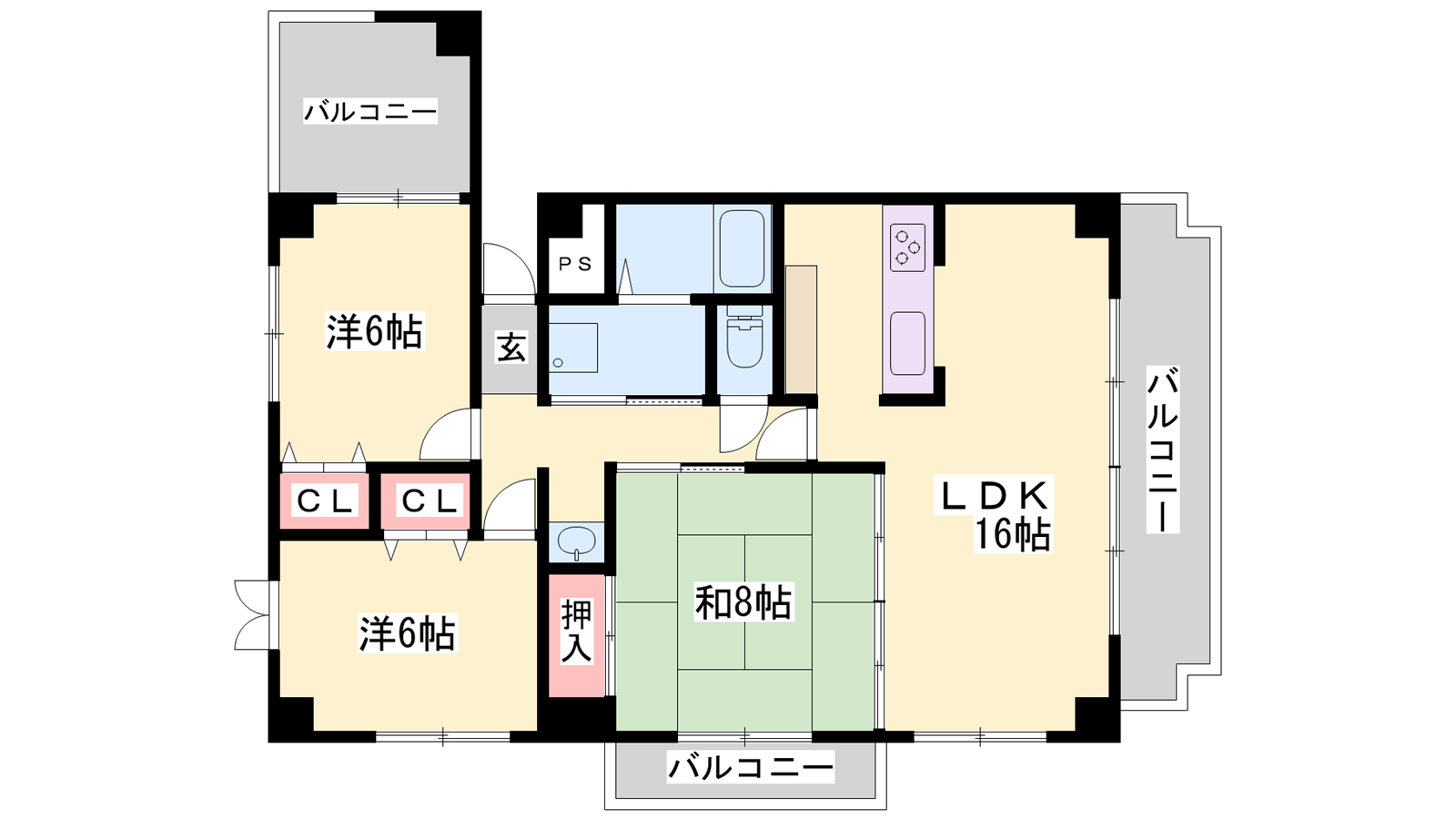 - LDK16帖、洋室6帖、洋室6帖、和室8帖