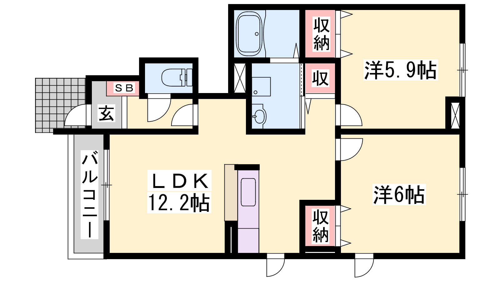 - LDK12.2帖、洋室6帖、洋室5.9帖