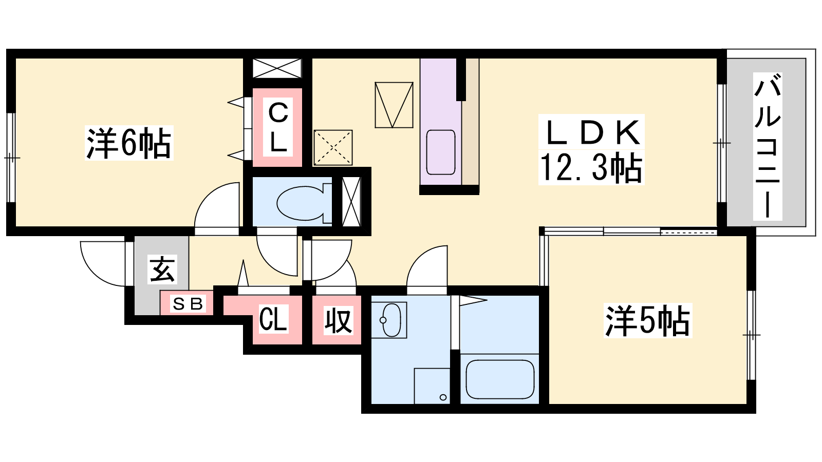 - LDK12.3帖、洋室6帖、洋室5帖