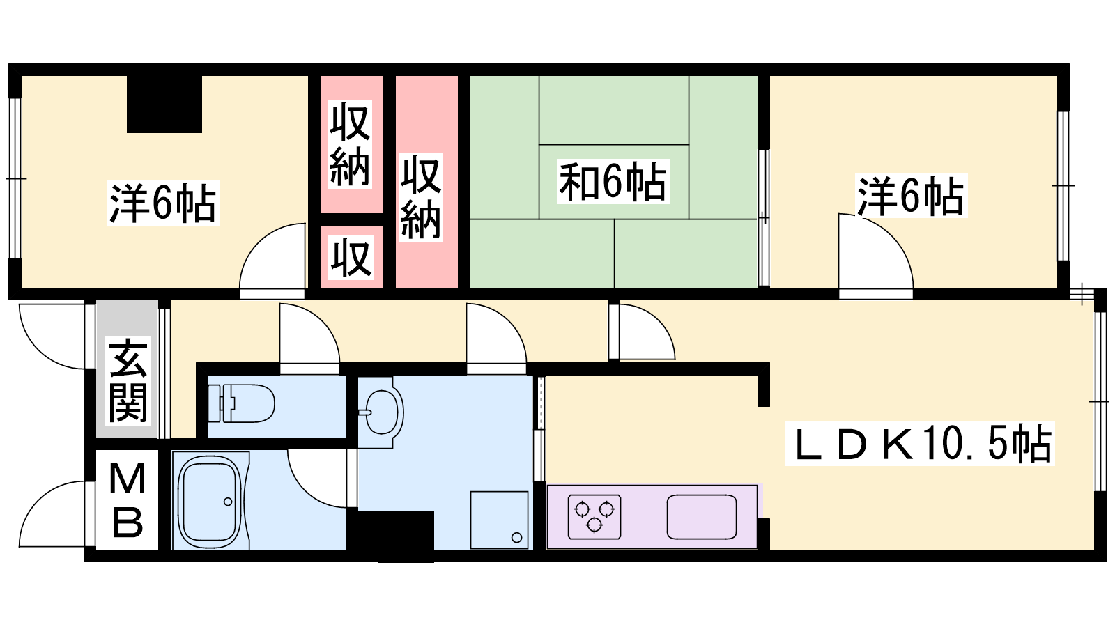 - LDK10.5帖、洋室6帖、洋室6帖、和室6帖