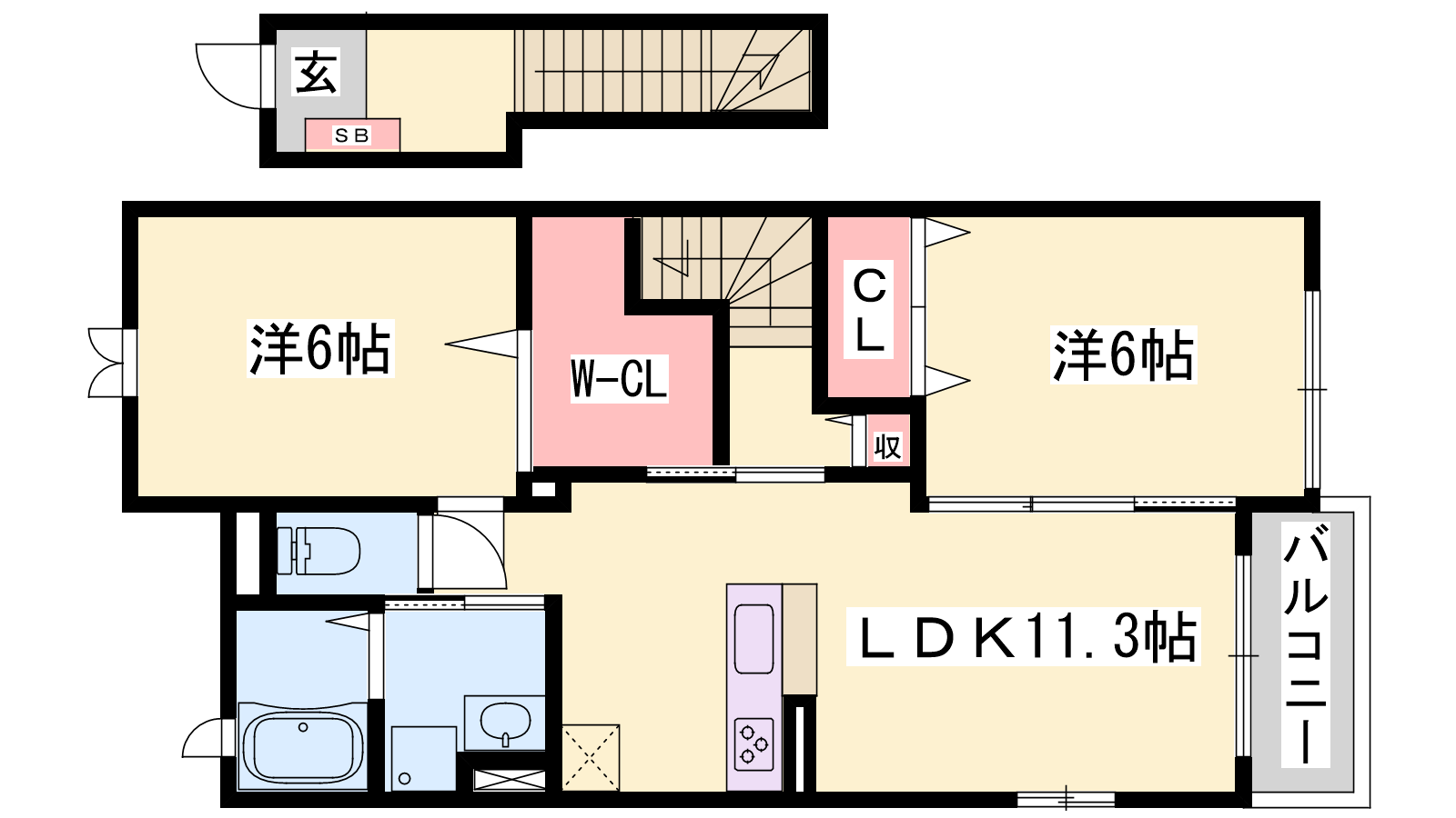 - LDK11.3帖、洋室6帖、洋室6帖