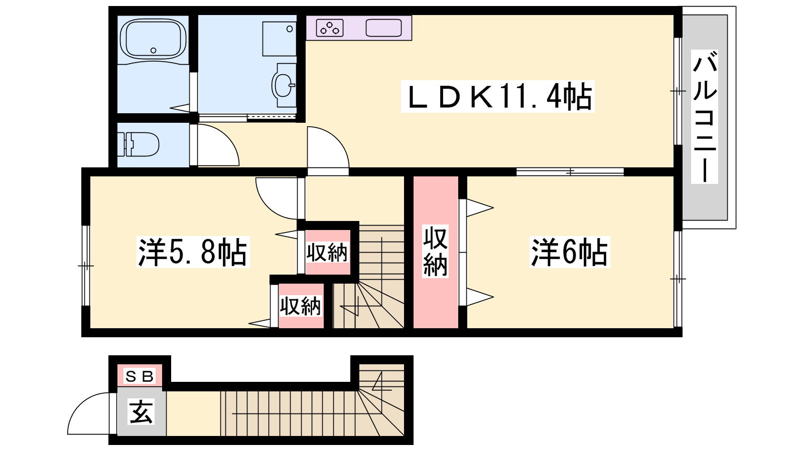 - LDK11.4帖、洋室6帖、洋室5.8帖