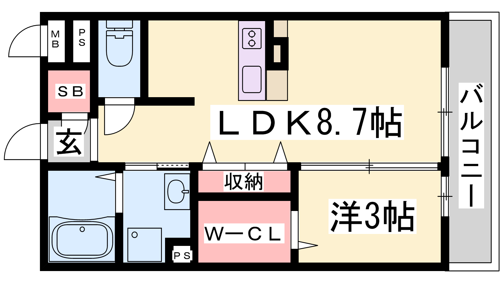 - LDK8.7帖、洋室3帖