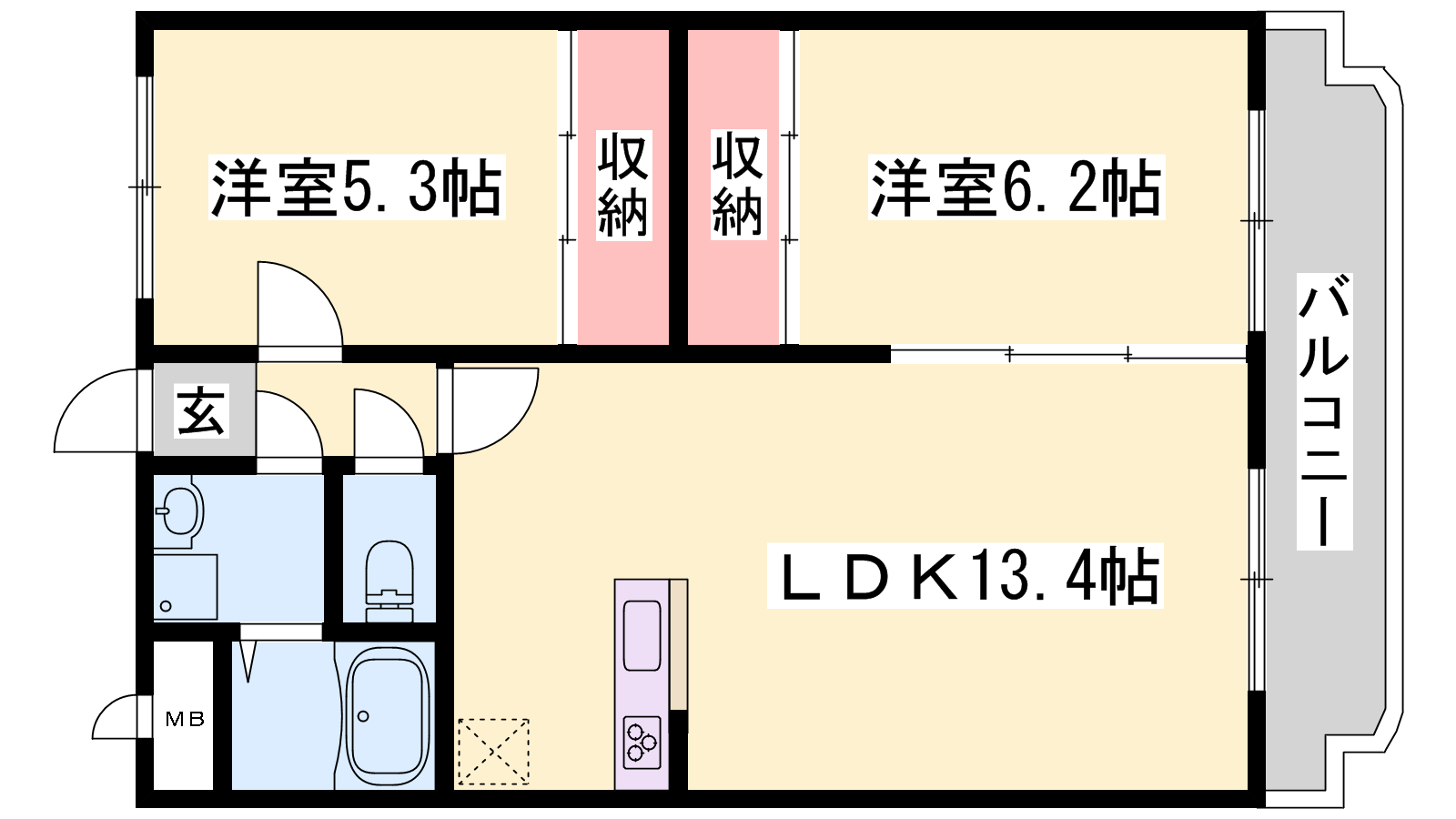 - LDK13.4帖、洋室5.3帖、洋室6.2帖