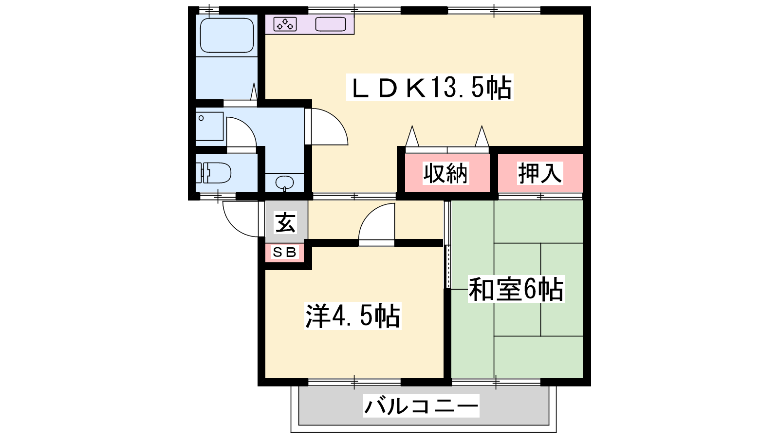 - LDK13.5帖、洋室4.5帖、和室6帖