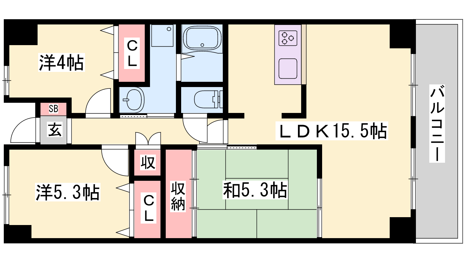 - LDK15.5帖、洋室5.3帖、和室5.3帖、洋室4帖
