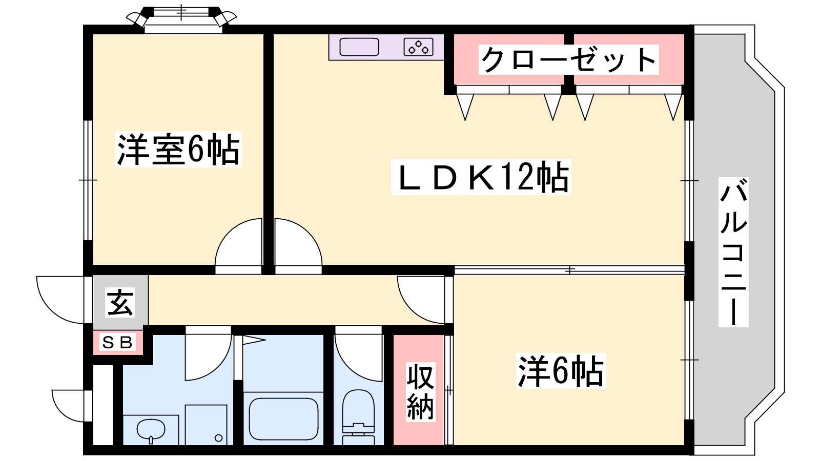 - LDK12帖、洋室6帖、洋室6帖