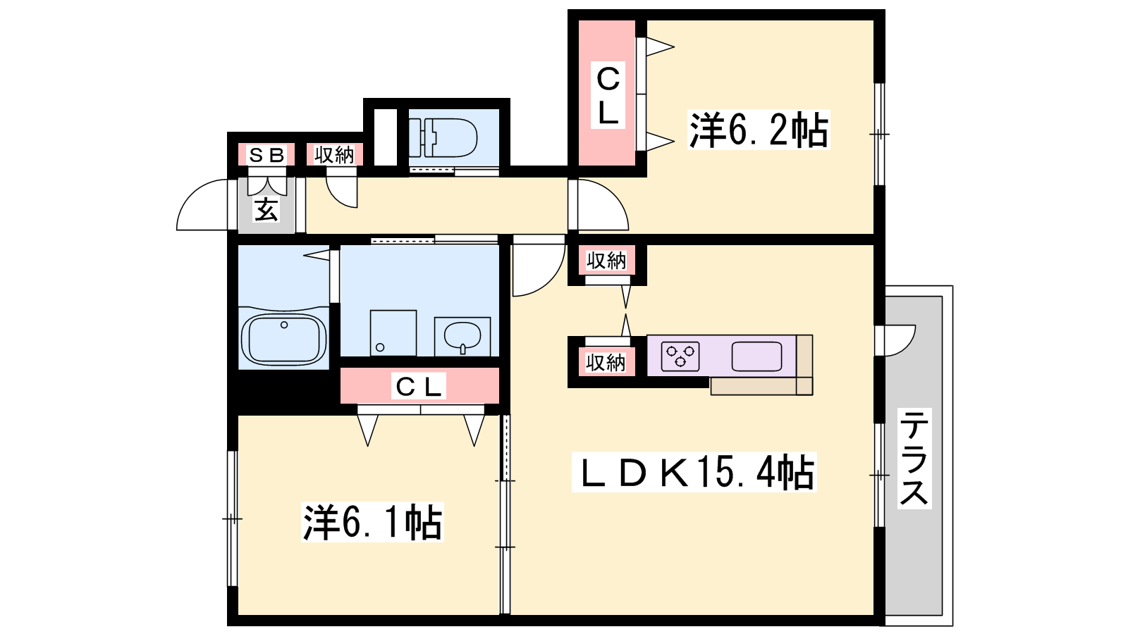 - LDK15.4帖、洋室6.2帖、洋室6.1帖