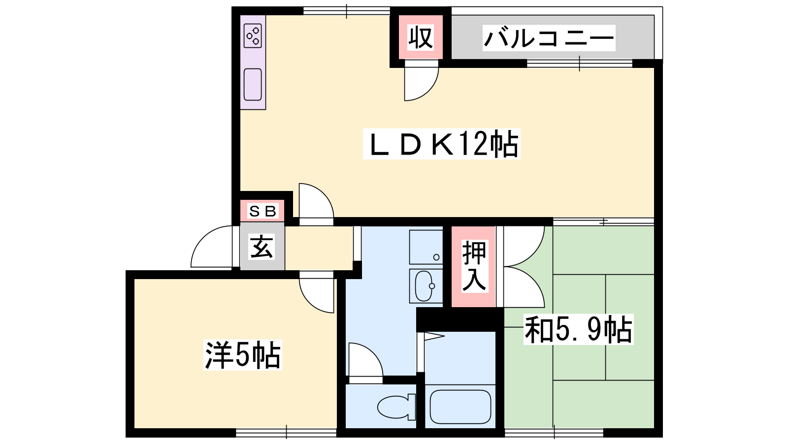 - LDK12帖、洋室5帖、和室5.9帖