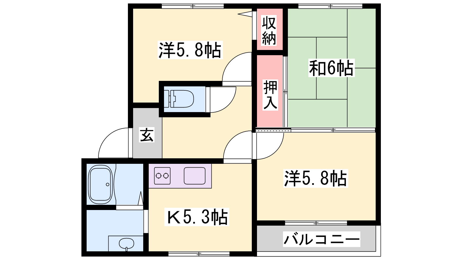 - DK5.3帖、洋室5.8帖、和室5.9帖、洋室5.8帖