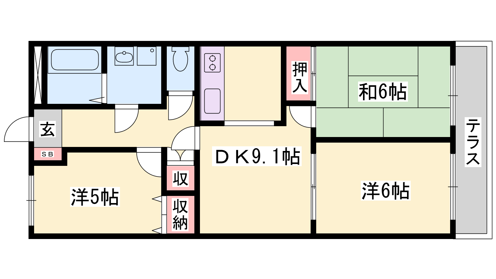 - DK9.1帖、洋室6帖、洋室5帖、和室6帖