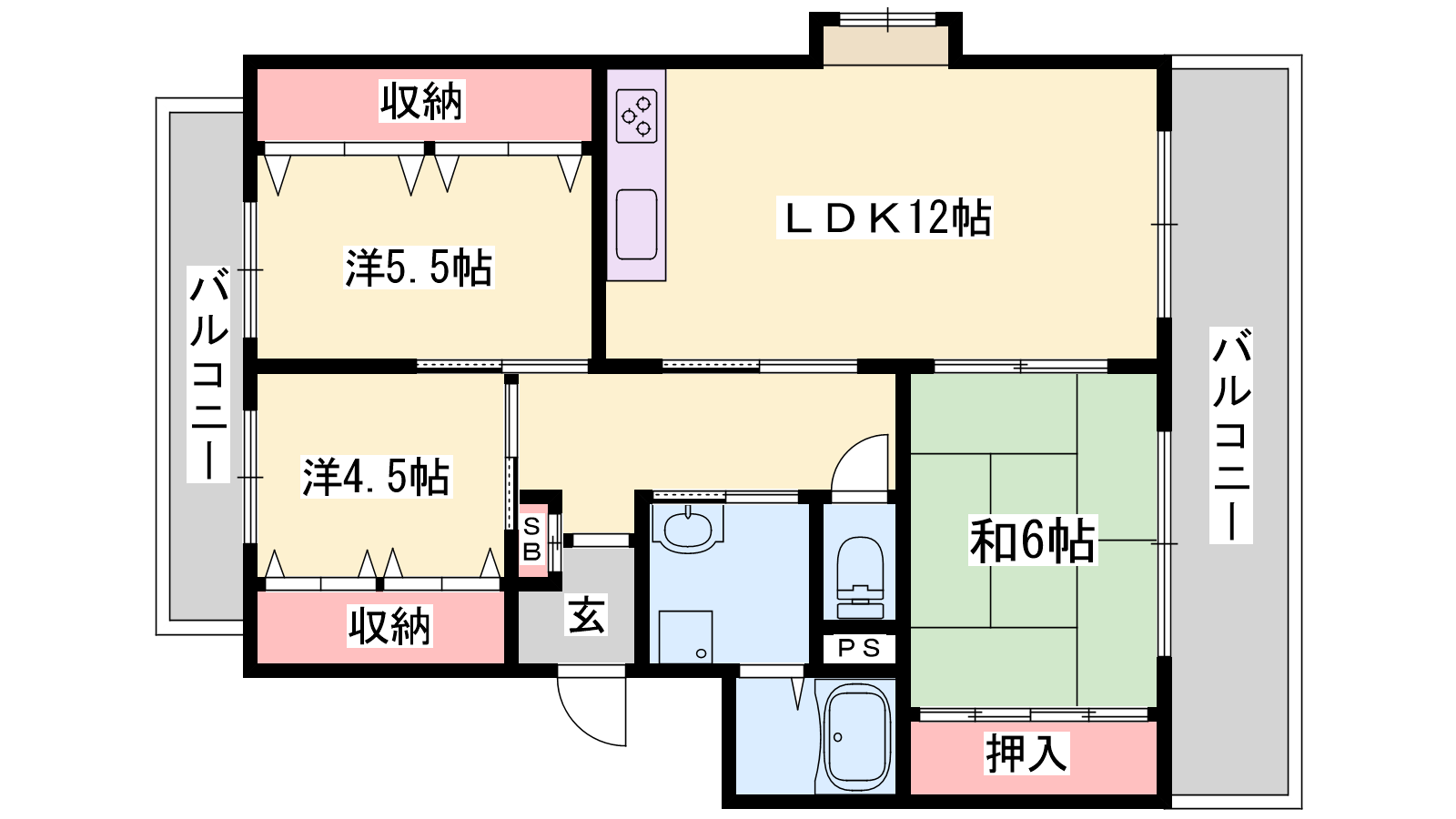 - LDK12帖、洋室5.5帖、洋室4.5帖、和室6帖