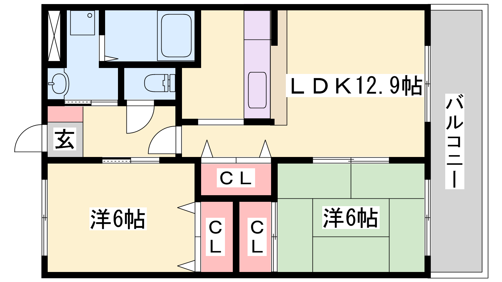 - LDK12.9帖、洋室6帖、和室6帖