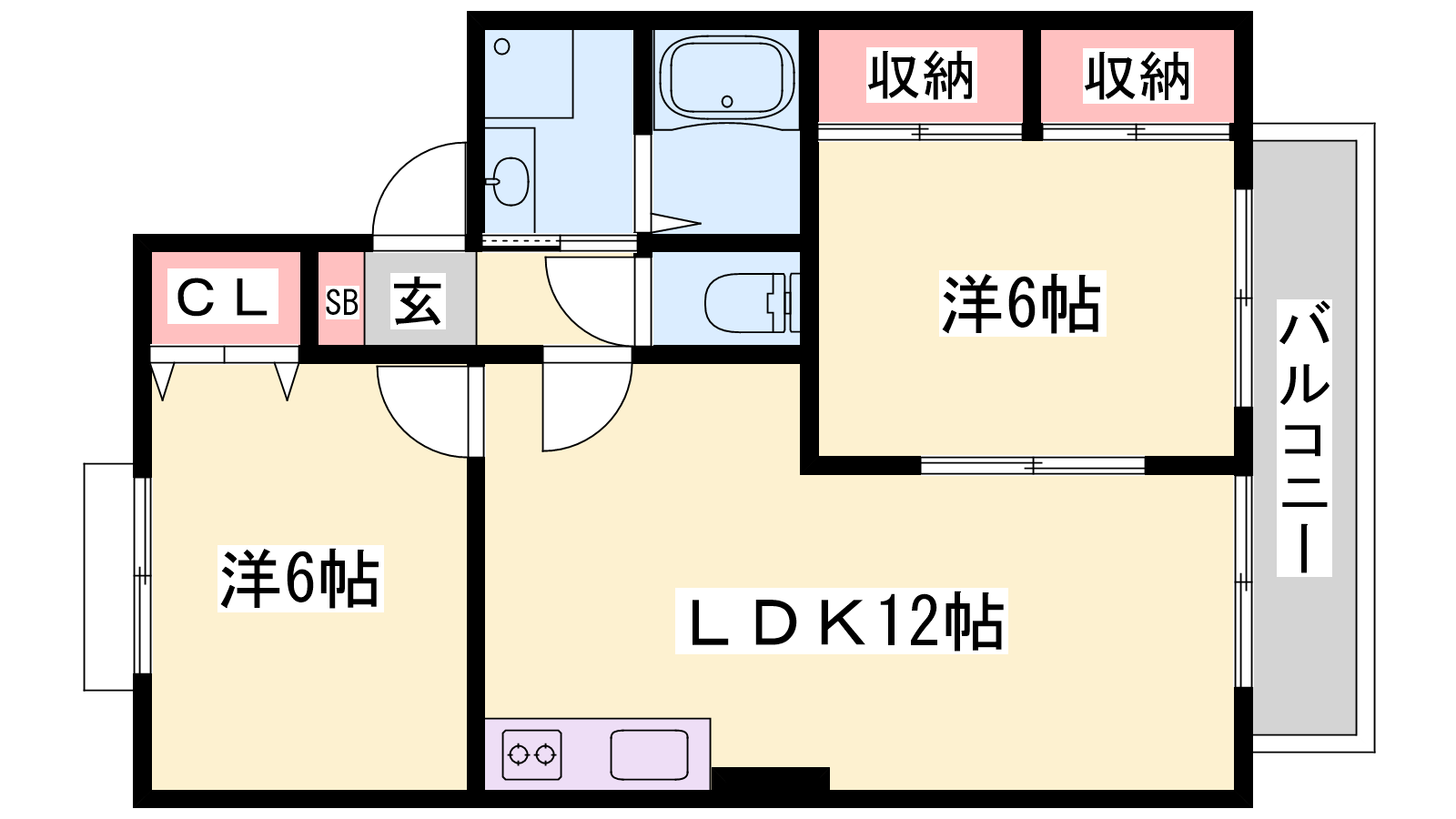 - LDK12帖、洋室6帖、洋室6帖