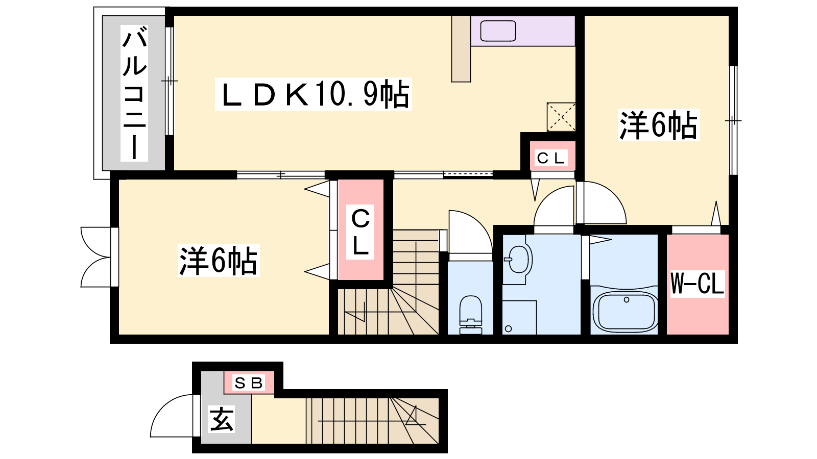 - LDK10.9帖、洋室6帖、洋室6帖