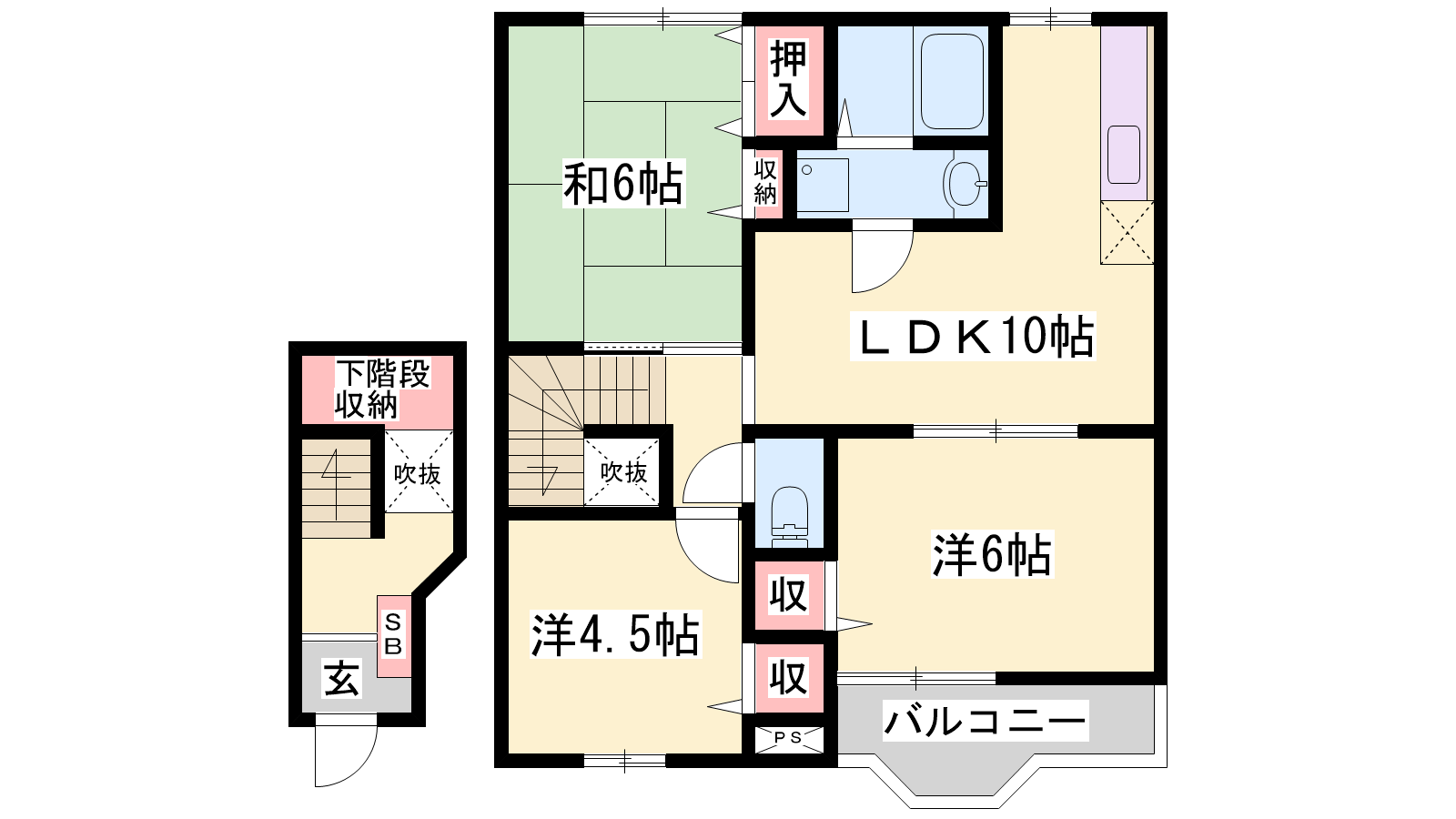 - LDK10帖、洋室6帖、洋室4.5帖、和室6帖