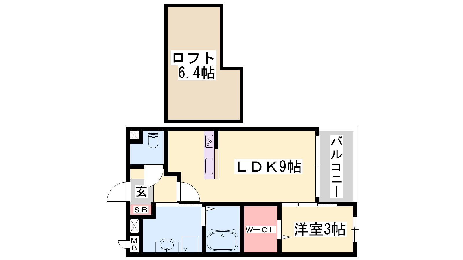 - LDK9帖、洋室3帖