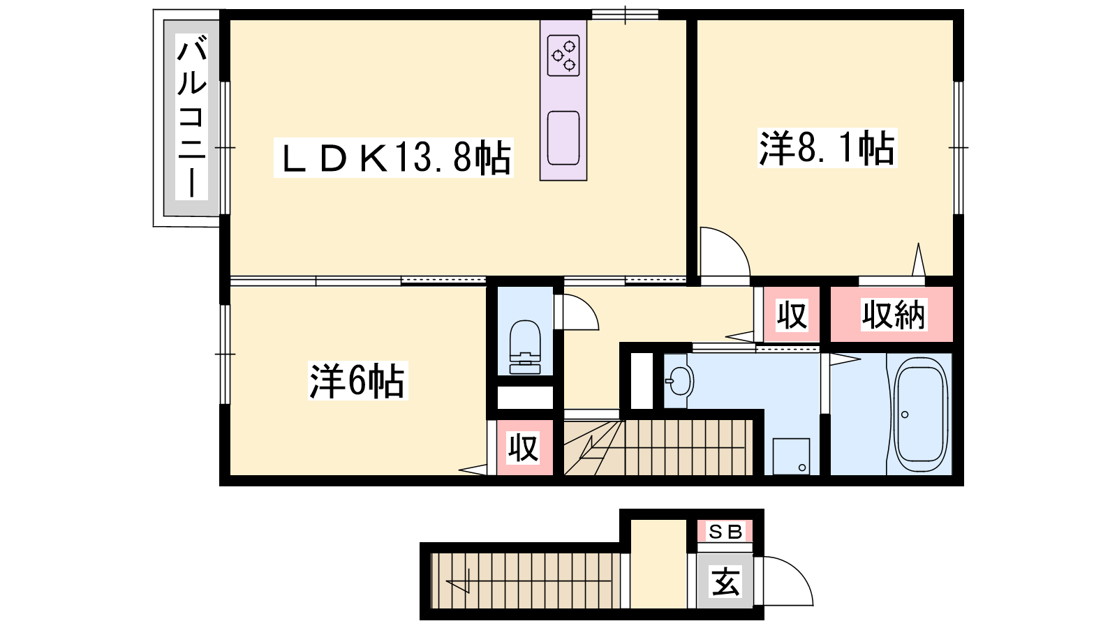 - LDK13.8帖、洋室8.1帖、洋室6帖