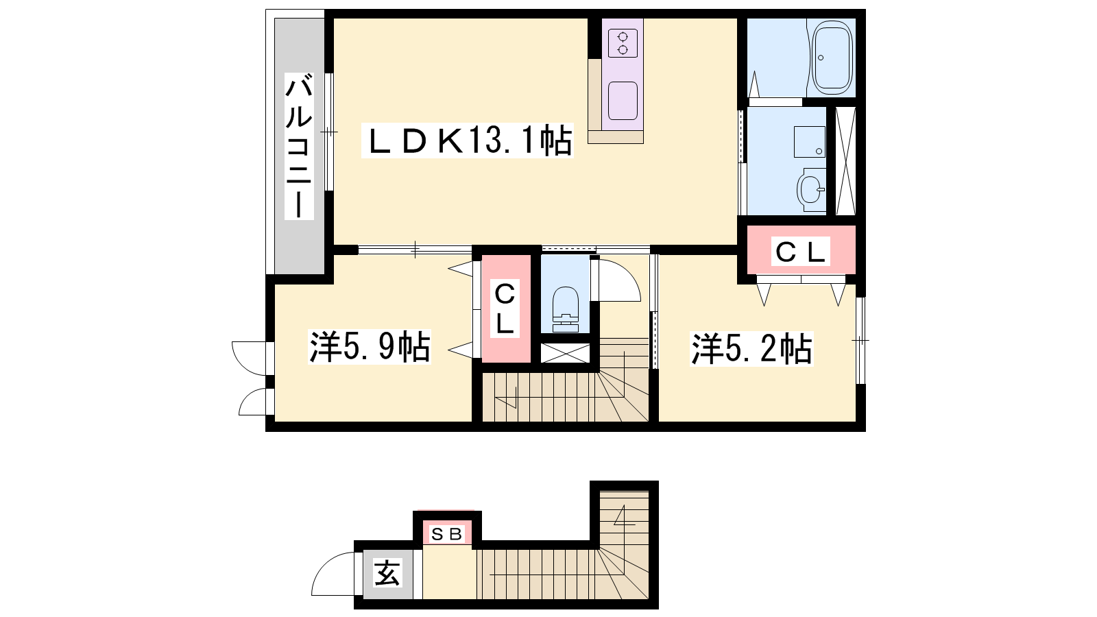 - LDK13帖、洋室5.9帖、洋室5.2帖