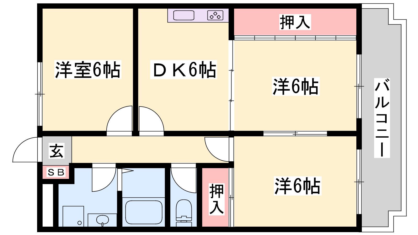 - DK6帖、洋室6帖、洋室6帖、洋室6帖