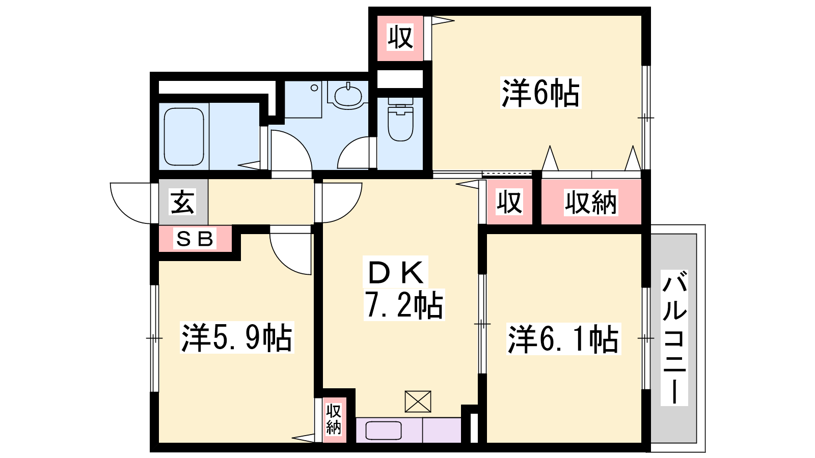 - DK7.2帖、洋室6.1帖、洋室6帖、洋室5.9帖