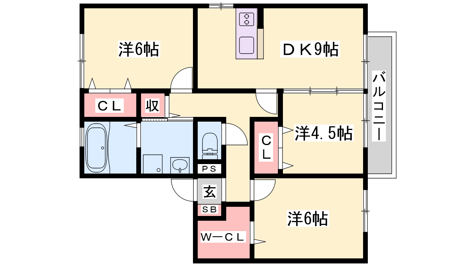 - LDK9帖、洋室6帖、洋室6帖、洋室4.5帖