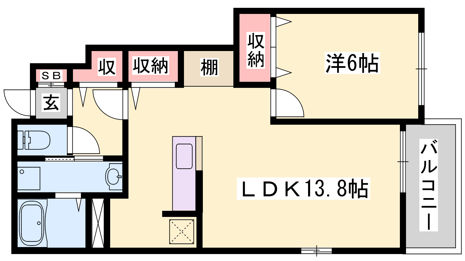 - LDK13.8帖、洋室6帖