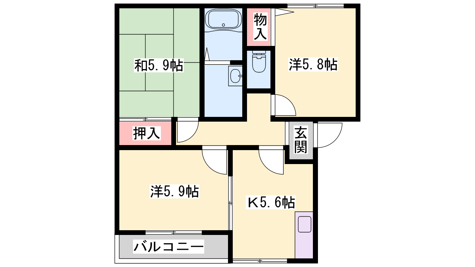 - K5.6帖、洋室5.8帖、洋室5.9帖、和室5.9帖