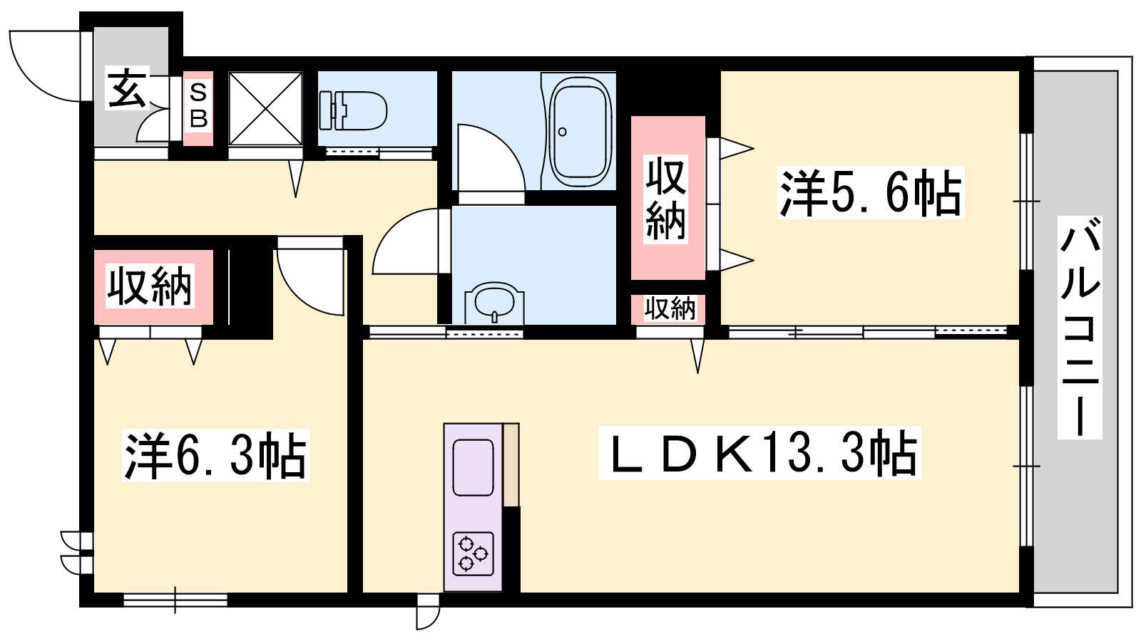 - LDK13帖、洋室6.3帖、洋室5.6帖