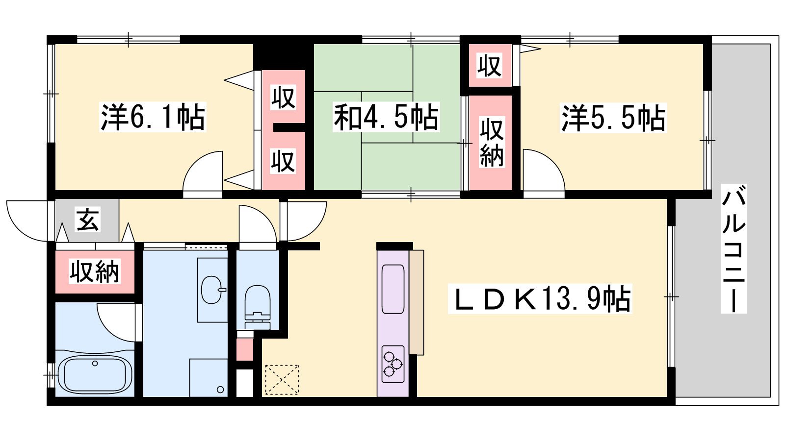 - LDK13.9帖、洋室6.1帖、洋室5.5帖、和室4.5帖