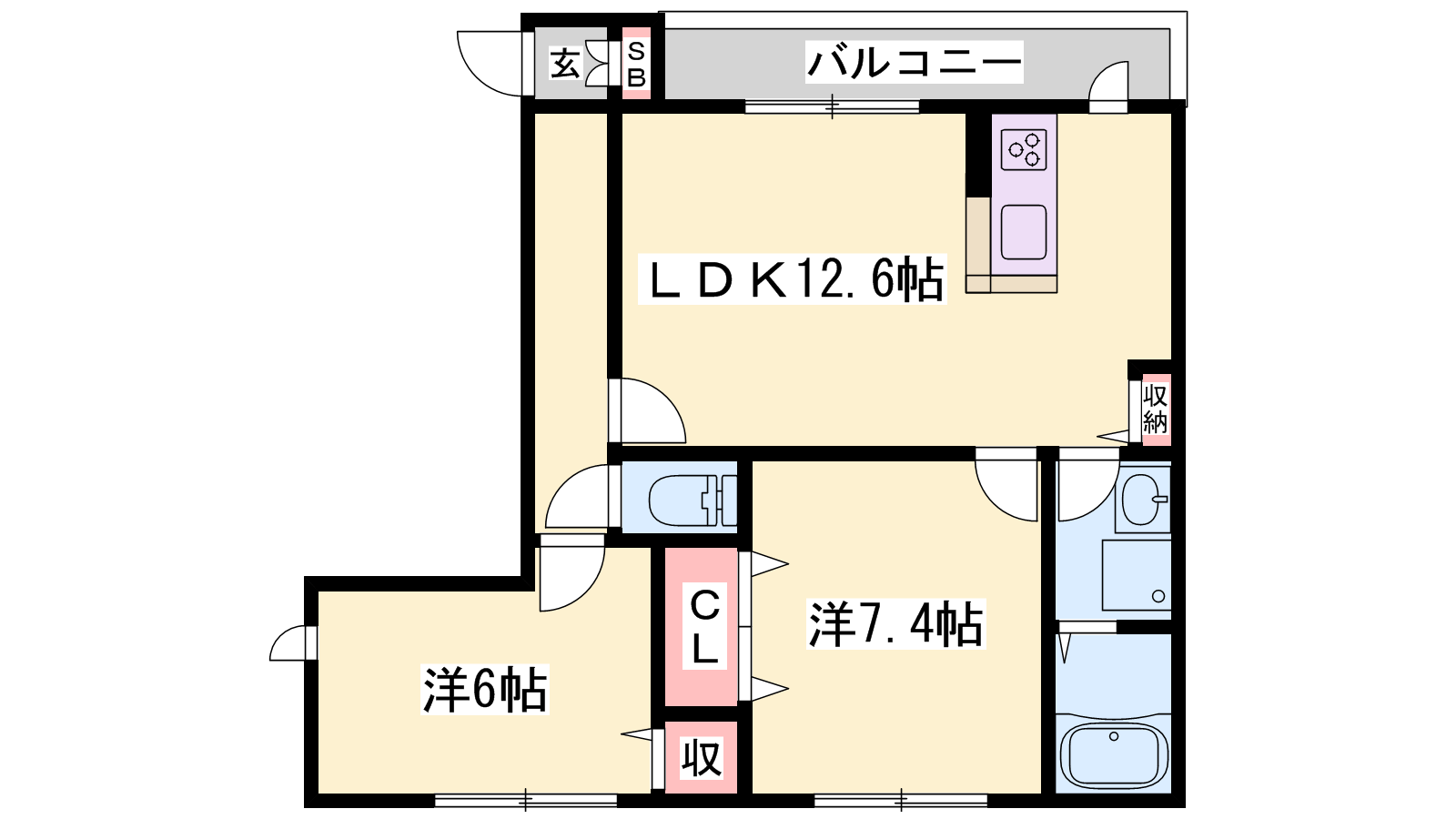 - LDK12.6帖、洋室7.4帖、洋室6帖
