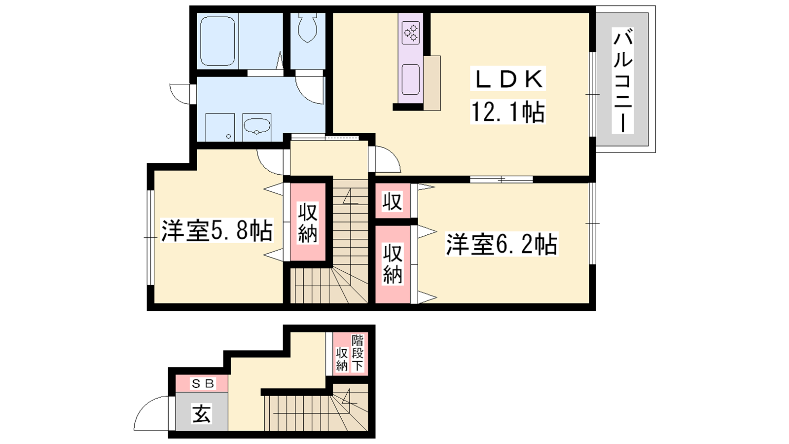 - LDK12.1帖、洋室6.2帖、洋室5.8帖