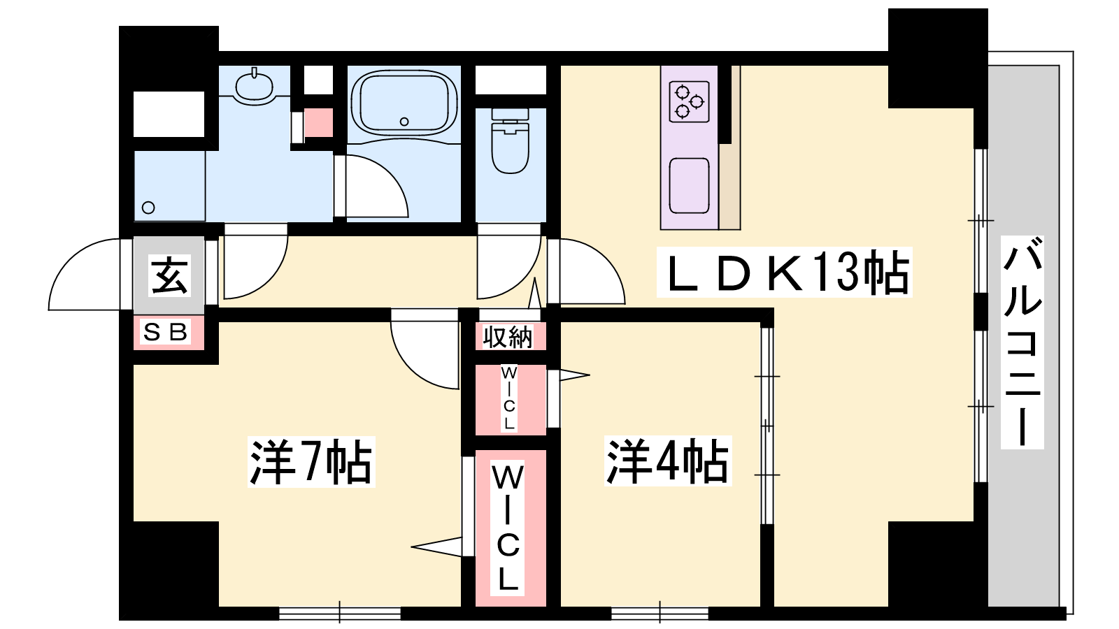 - LDK13帖、洋室7帖、洋室4帖
