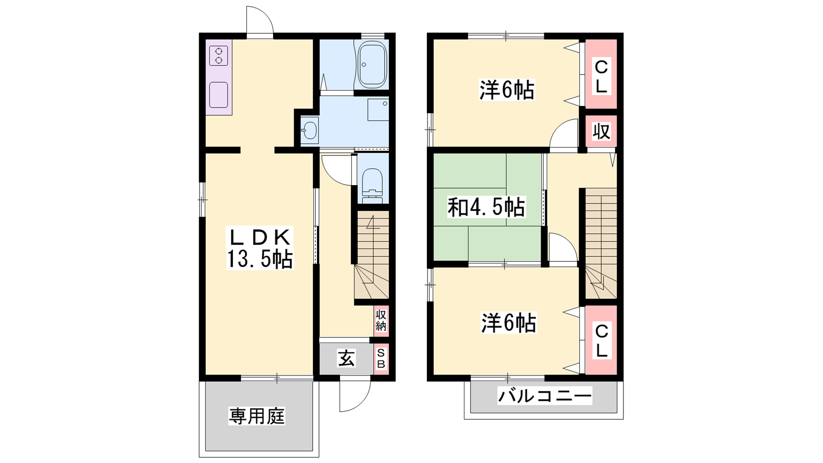 - LDK13.5帖、洋室6帖、洋室6帖、和室4.5帖