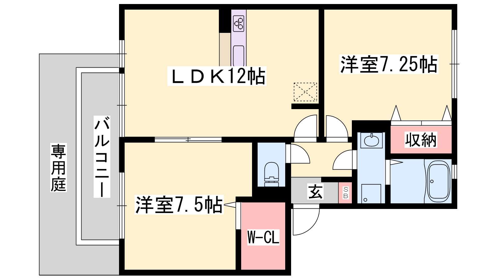 - LDK12帖、洋室7.5帖、洋室7.25帖