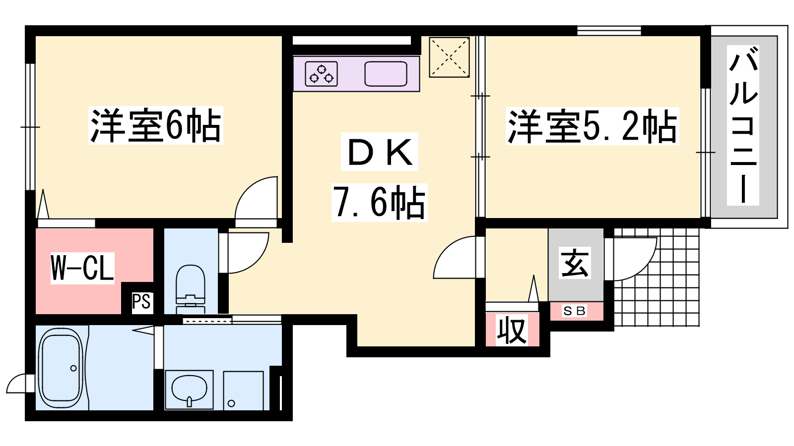 - DK7.6帖、洋室6帖、洋室5.2帖