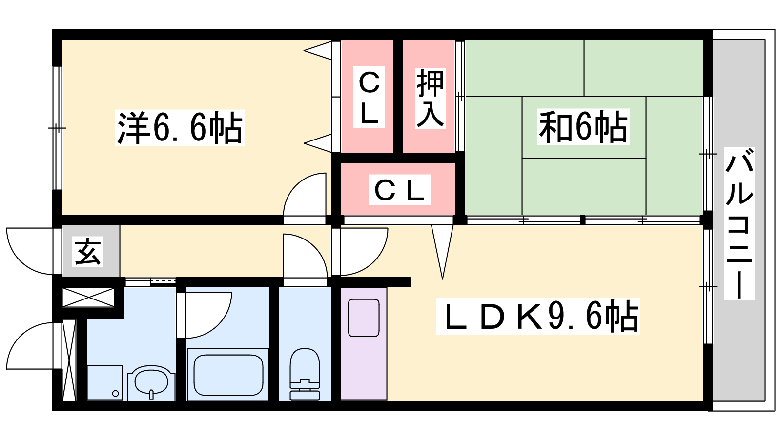 - LDK9.6帖、洋室6.6帖、和室6帖