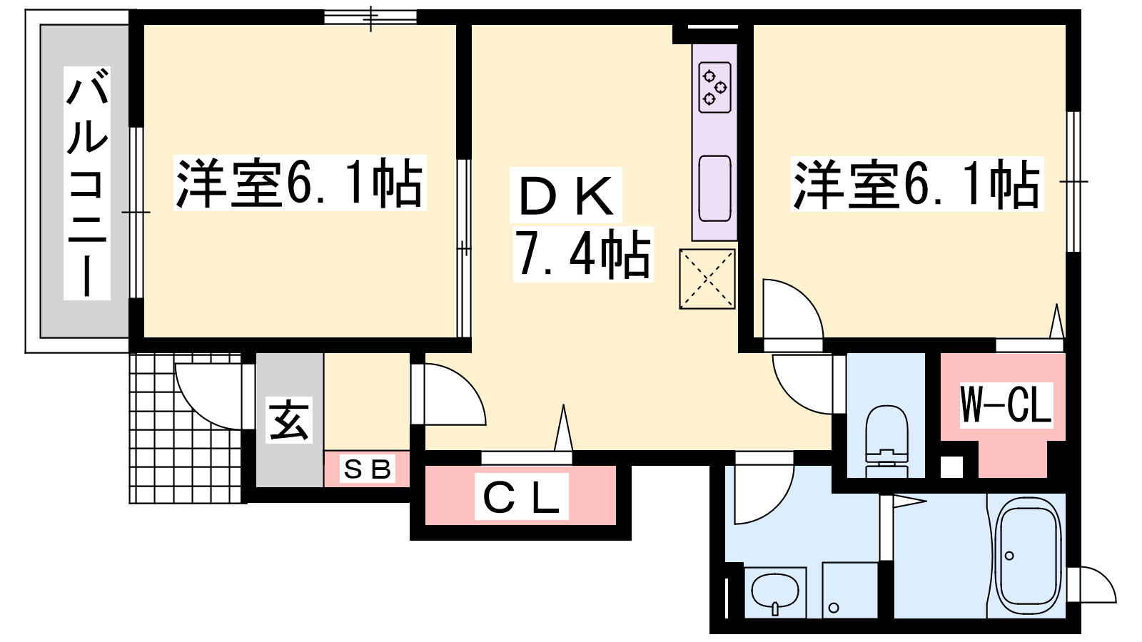 - DK7.4帖、洋室6.1帖、洋室6.1帖