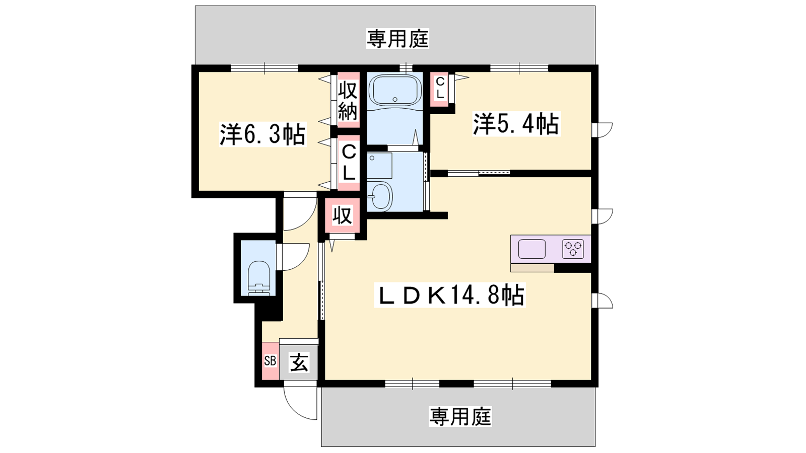 - LDK14.8帖、洋室6.3帖、洋室5.4帖