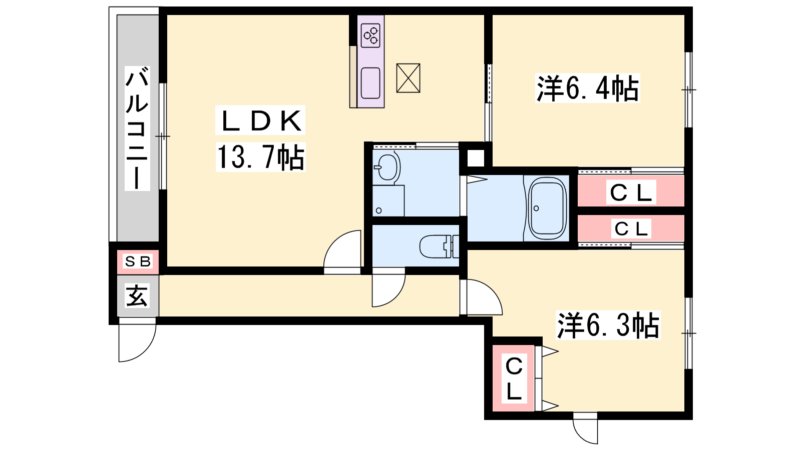 - LDK13.7帖、洋室6.4帖、洋室6.3帖