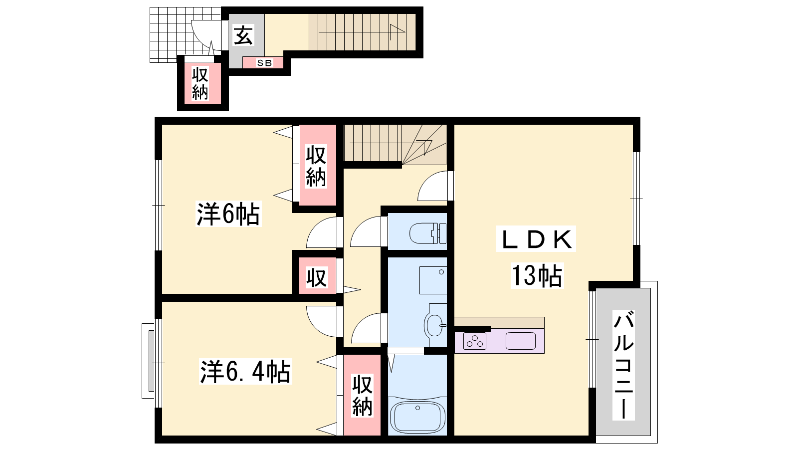 - LDK13帖、洋室6.4帖、洋室6帖