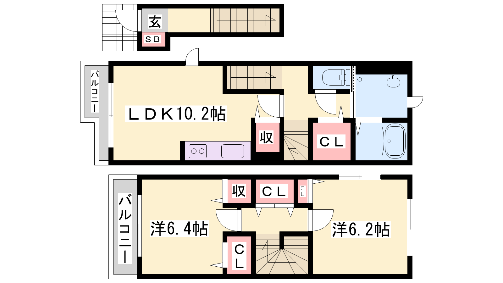 - LDK10.2帖、洋室6.4帖、洋室6.2帖