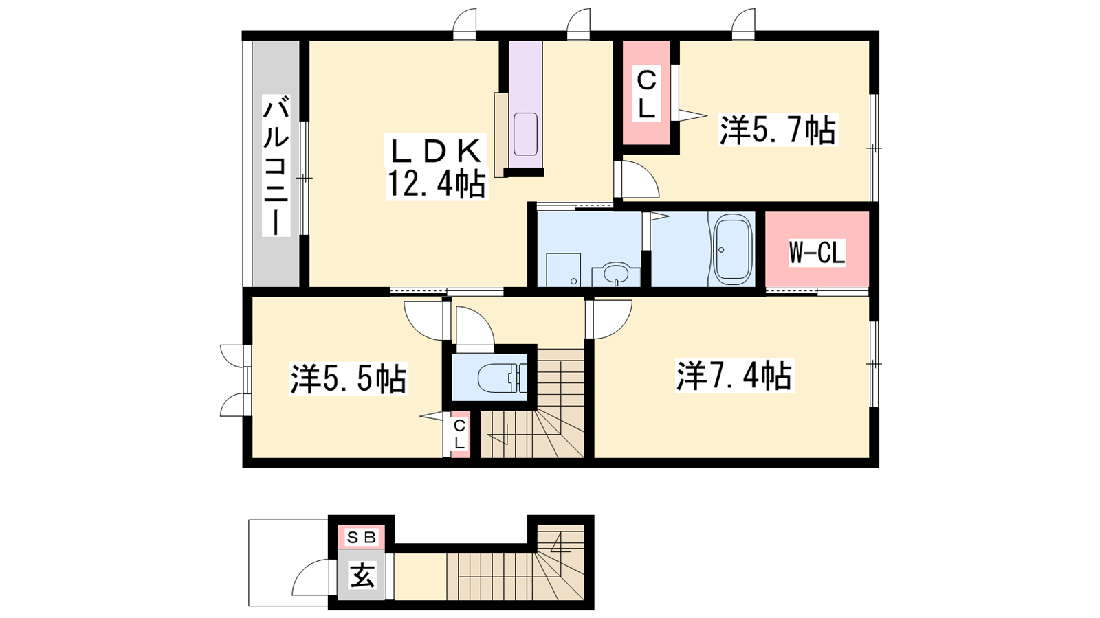 - LDK12.4帖、洋室7.4帖、洋室5.7帖、洋室5.5帖