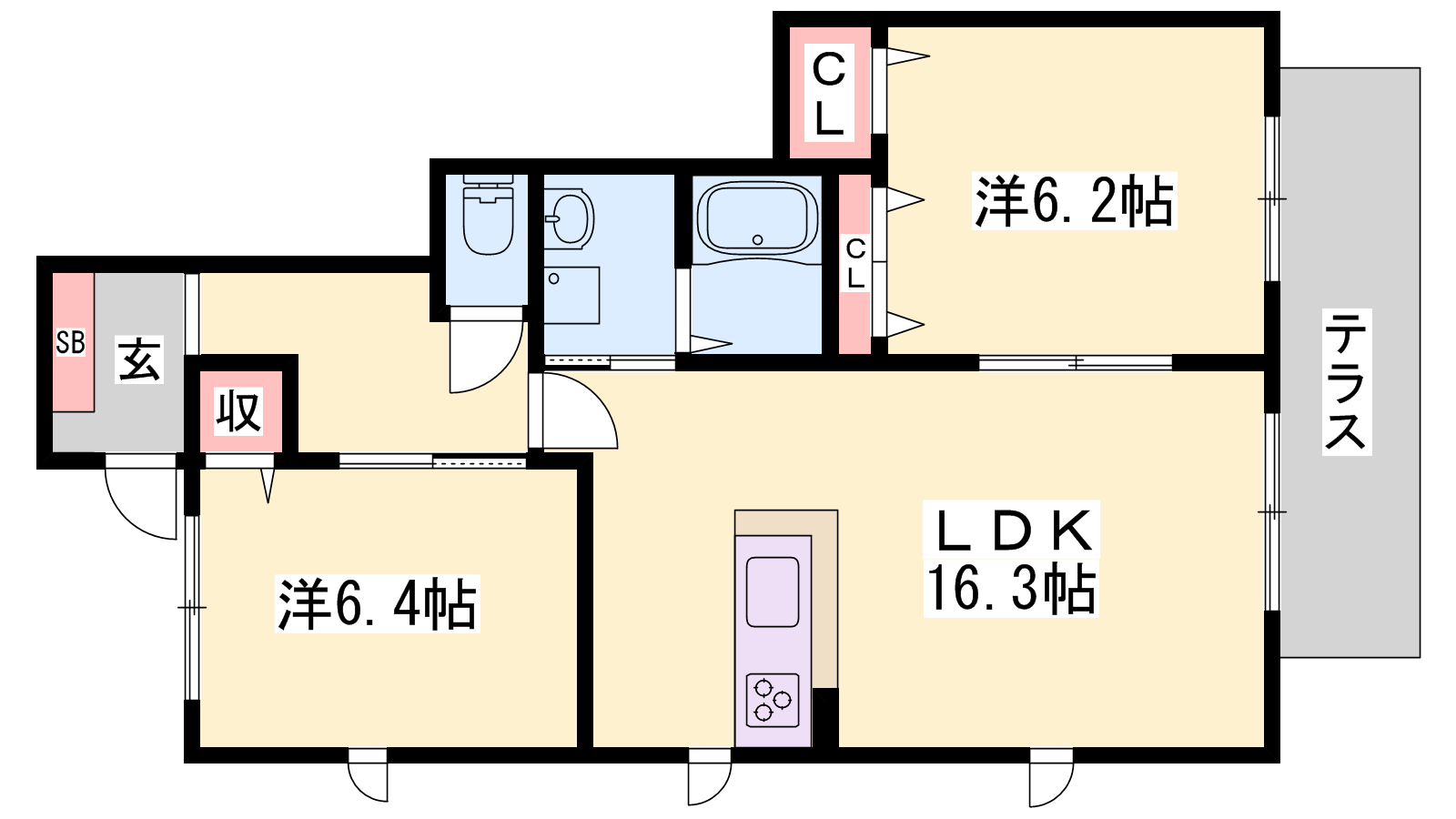 - LDK16.3帖、洋室6.4帖、洋室6.2帖