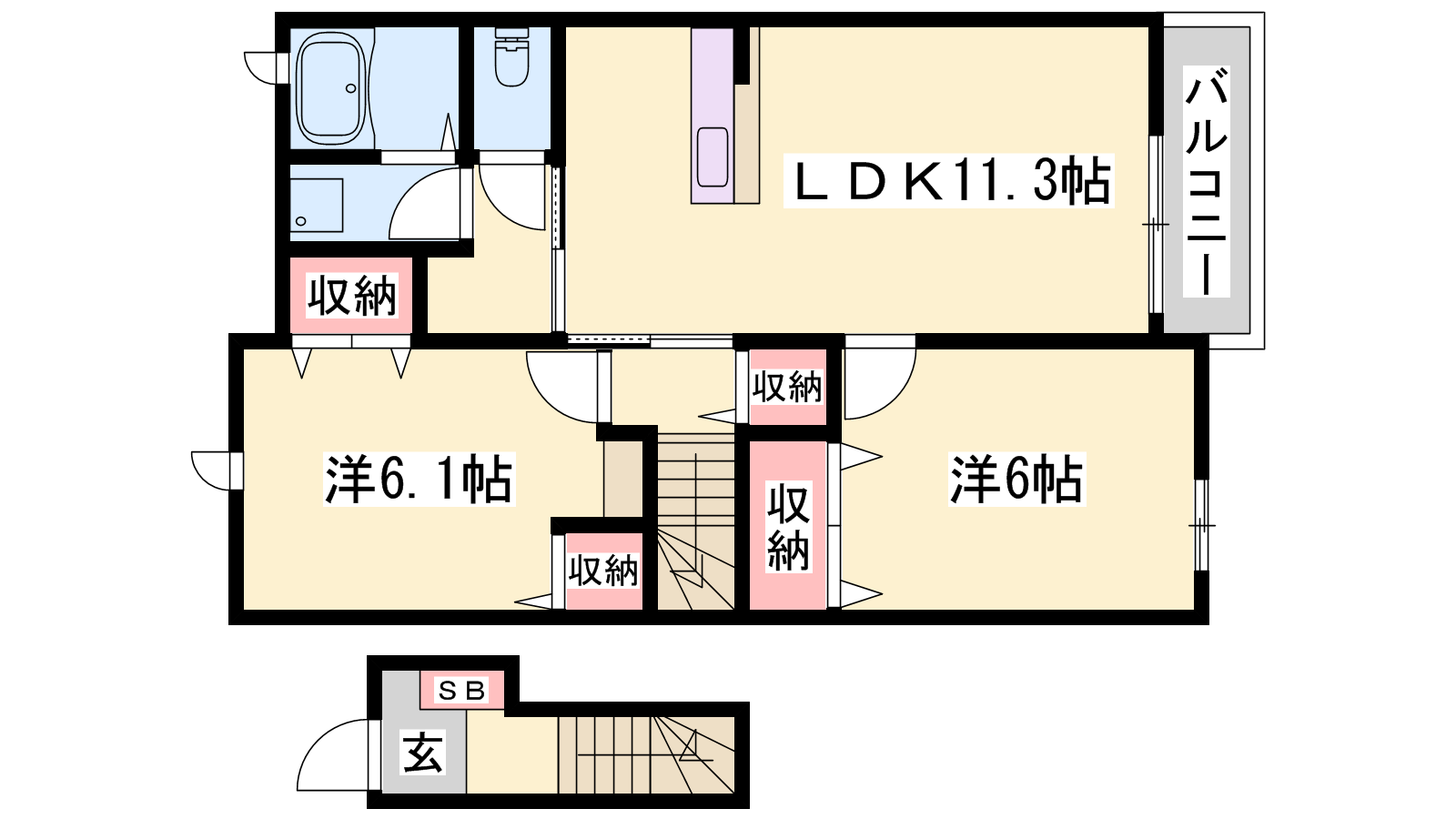 - LDK11.3帖、洋室6.1帖、洋室6帖