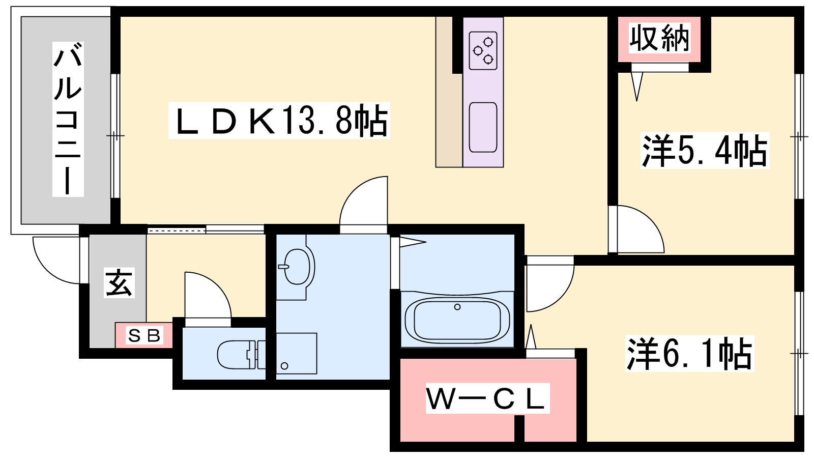 - LDK13.8帖、洋室6.1帖、洋室5.4帖