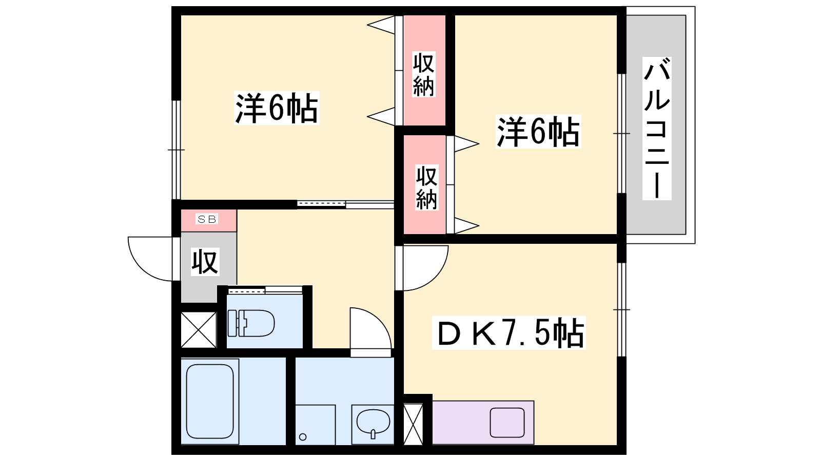 - DK7.5帖、洋室6帖、洋室6帖